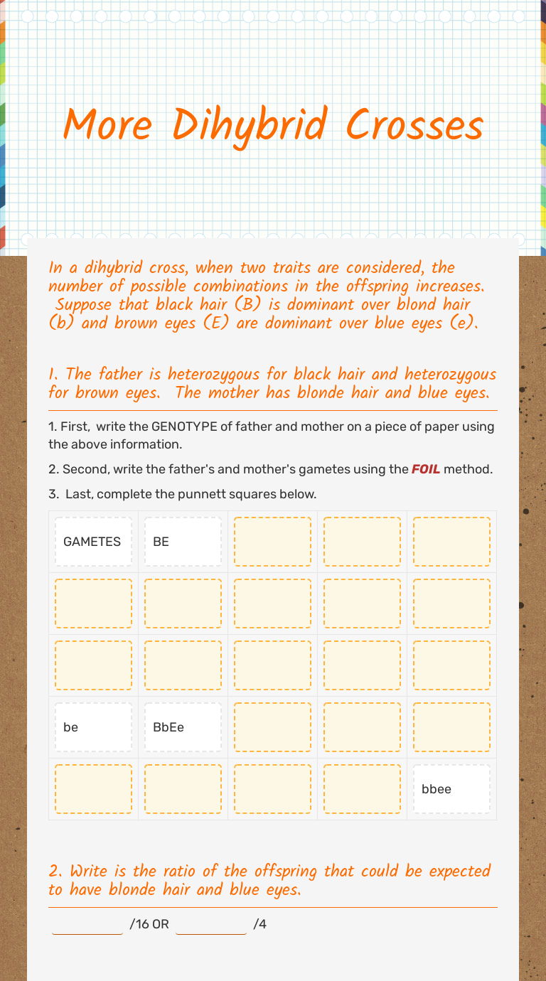 Punnett square are used to predict the possibility of different outcomes. Shading in each punnett square represents matching phenotypes, assuming complete dominance and independant assortment of genes, phenotypic ratios are also presented. Guidelines for dihybrid punnett squares 1. If two cyclops that are heterozygous for both traits are crossed, what are the resulting phenotypes and in what proportion? This ratio stays the same no matter how many offspring the parents decide to have. Punnett squares take each of the possible alleles that the parent can pass down and predicts all possible outcomes for the offspring. What are the phenotypes (descriptions) of rabbits that have the following genotypes 10. In a cross between a dominant homozygote and a recessive homozygote, all the offspring will have a heterozygous genotype and a dominant phenotype. The offspring will show the what is the size of a punnett square used in a dihybrid cross? Do you know where each letter two pea plants, both heterozygous for flower color, are crossed. Punnett squares are useful in genetics to diagram possible genotypes of the offspring of two organisms. Why do we use them? =punnett squares= the punnett square below shows a '''monohybrid cross''' between two heterozygous.